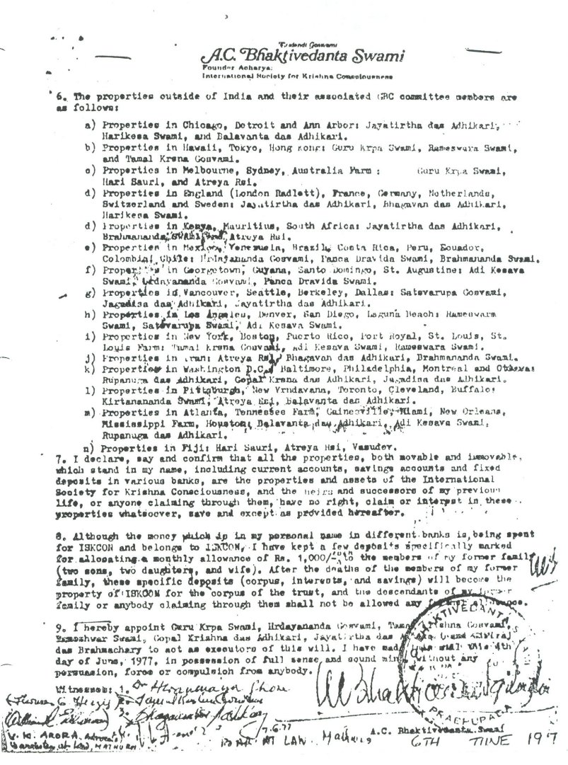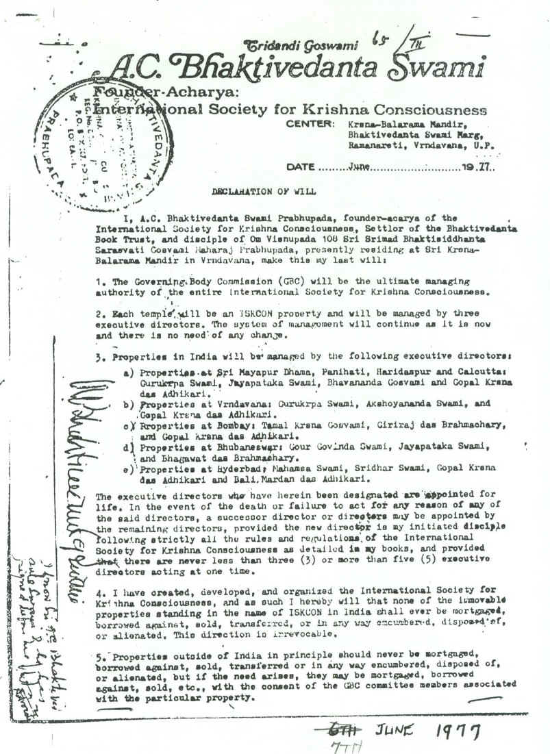 Его Божественная Милость А.Ч. Бхактиведанта Свами Прабхупа̄да является Основателем-А̄ча̄рйей Международного Общества для Осознания Кр̣шн̣ы (ISKCON). За четыре месяца до своего ухода Ш́рӣла Прабхупа̄да написал завещание и издал Директиву от 9 июля 1977 года (смотрите "Приложение" Скан-копия оригинала Директивы от 9 июля 1977), где Он абсолютно ясно излагает Свою последнею волю. А воля а̄ча̄рйи – это воля Бога. В Своих книгах Ш́рӣла Прабхупа̄да также говорит, как должно функционировать Общество ISKCON после Его ухода на всём протяжении своего существования. Ш́рӣла Прабхупа̄да утверждает следующее: